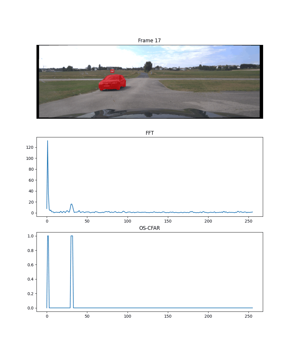 We refer interested readers to a paper with the rest of the KI-ASIC partners covering the main topics of automotive radar processing with SNNs [C]. In the animated figure below, there is an example of the data that has been used in the project and the output of the conversion to the frequency spectrum and the object detection.